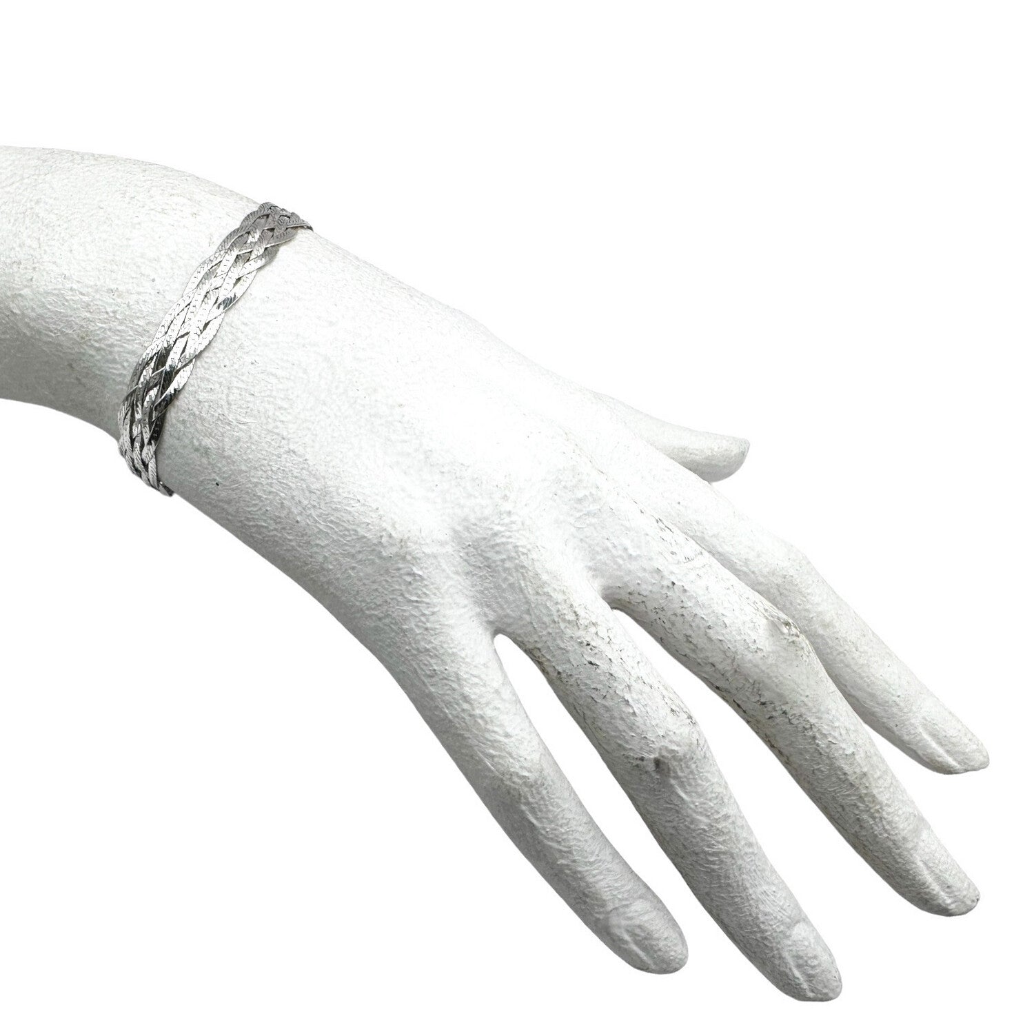 Met zijn verfijnde vlechtstructuur en heldere zilverglans is deze sterling zilveren schakelarmband een tijdloos sieraad dat moeiteloos klasse toevoegt aan elke pols. De meerdere, subtiel in elkaar gevlochten schakels zorgen voor een rijke textuur en een elegante uitstraling, terwijl het ontwerp soepel om de pols valt.